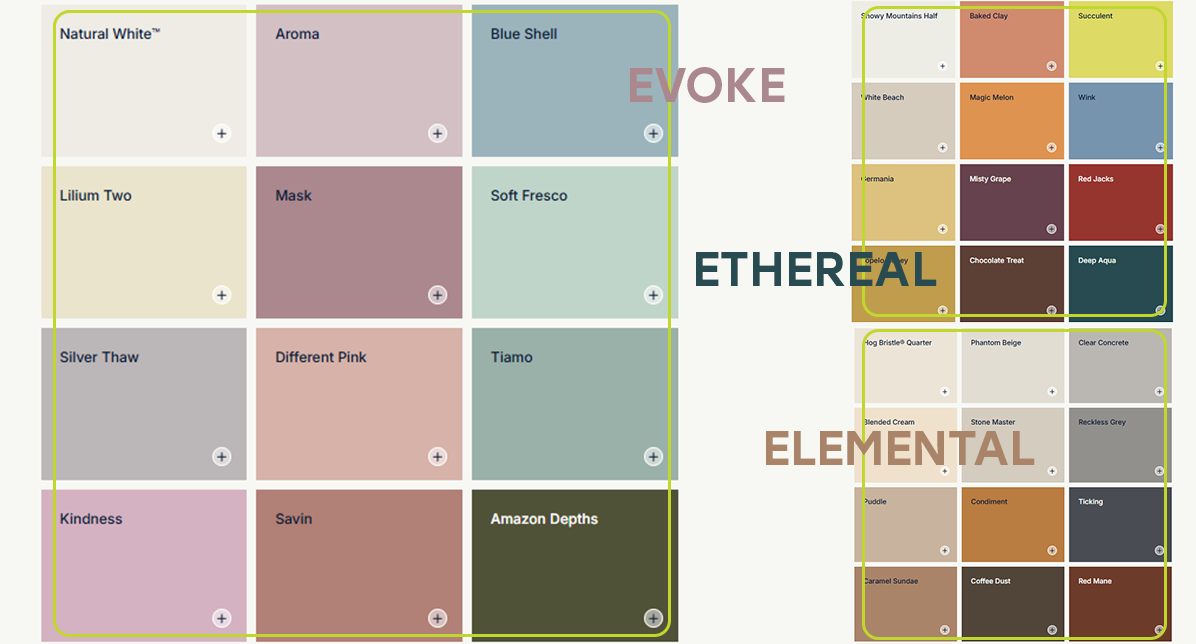 Their Evoke Palette is all about rich tones that create “depth, character and warmth” and suggest a nod to nostalgia and imperfection. Their pick also includes a warm white and an aqua.